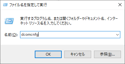 - Windowsキー + Rにて「ファイル名を指定して実行」を開き「dcomcnfg」と入力。