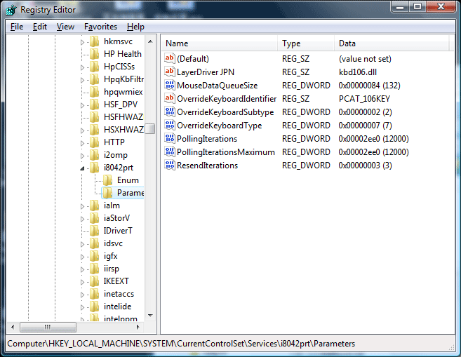 HKEY_LOCAL_MACHINE\SYSTEM\CurrentControlSet\services\i8042prt\Parameters