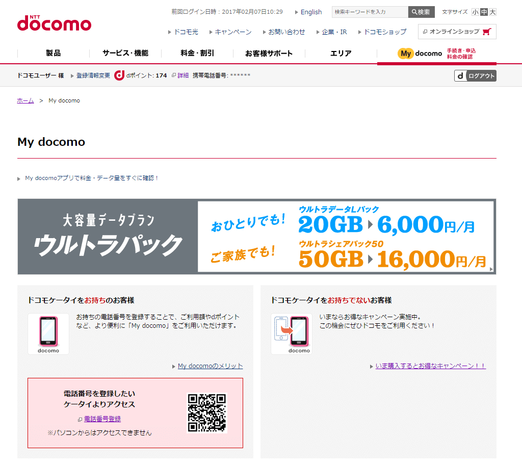 番号の登録が終了しているdアカウントでは前回あった左側の番号登録のメニューが消えているのがわかる。