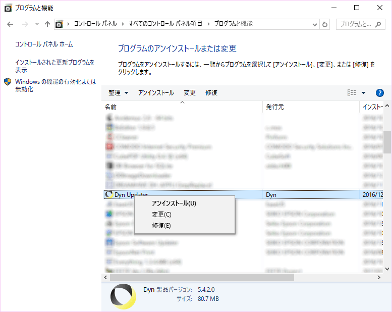 Windowsの「プログラムと機能」から「Dyn Updater」を探し、右クリックから「修復(E)」を選択し画面の指示に従う。