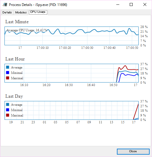 問題点はiSpyのソフトウェアに起因していたが、現在ダウンロードできるiSpy 64 v7.1.8.0にアップデートすればCPU使用率が跳ね上がる事もなく通常のCPU利用率内で収まる。