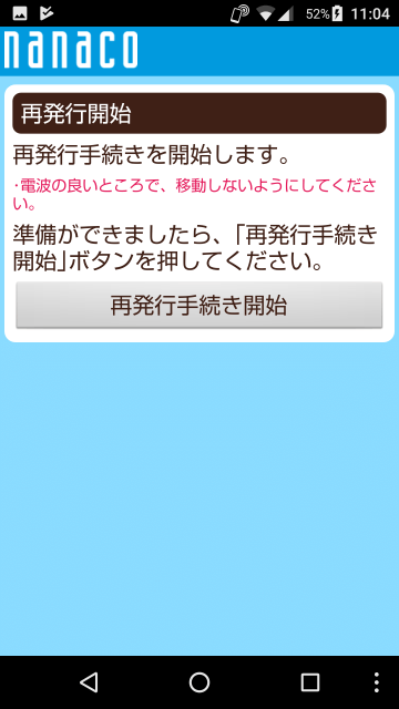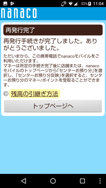 - 再びnanacoアプリを作動し、「再発行手続き」をタップ。→ 引継ぎ番号の入力