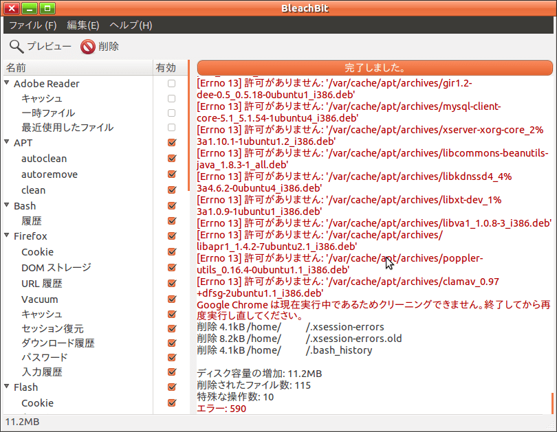 注意事項として何もアプリケーションを作動していない状態でBleachBitは実行するといいと思う。Ubuntuというよりlinuxが不慣れな自分にとって未知のOSで未知のソフトではどのような挙動が起こるか分からないからだ。