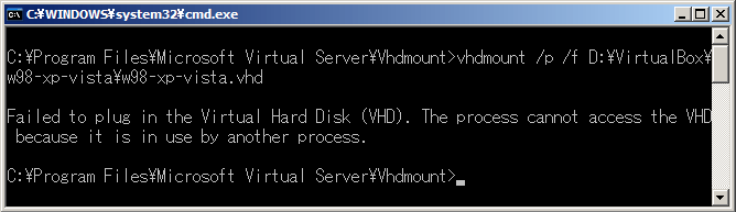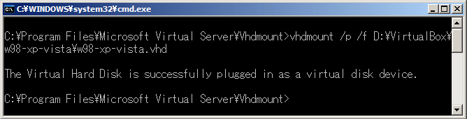 もし、マウントしたいVHDファイルが D:\VirtualBox\w98-xp-vista.vhd にあるなら以下の様にコマンドラインで入力する