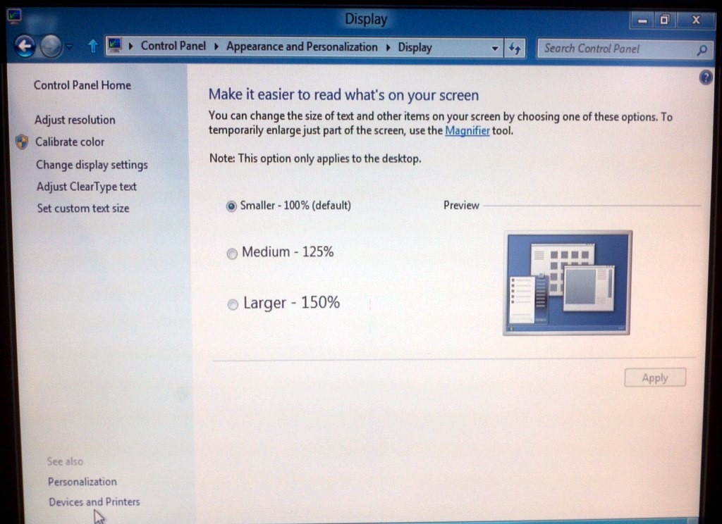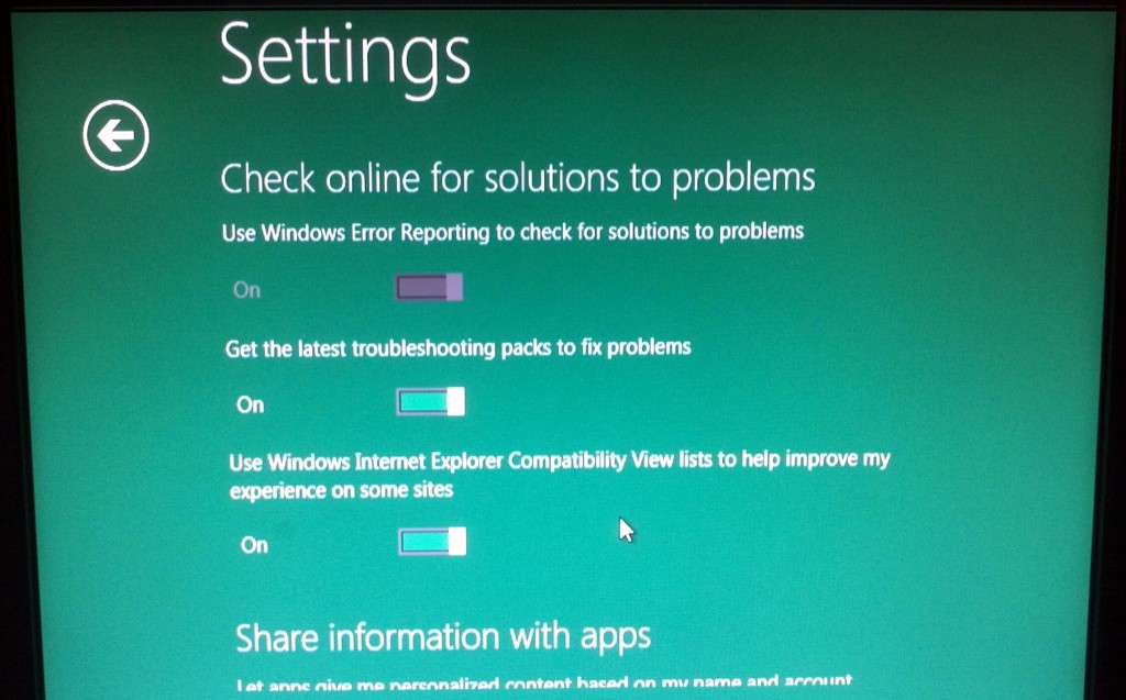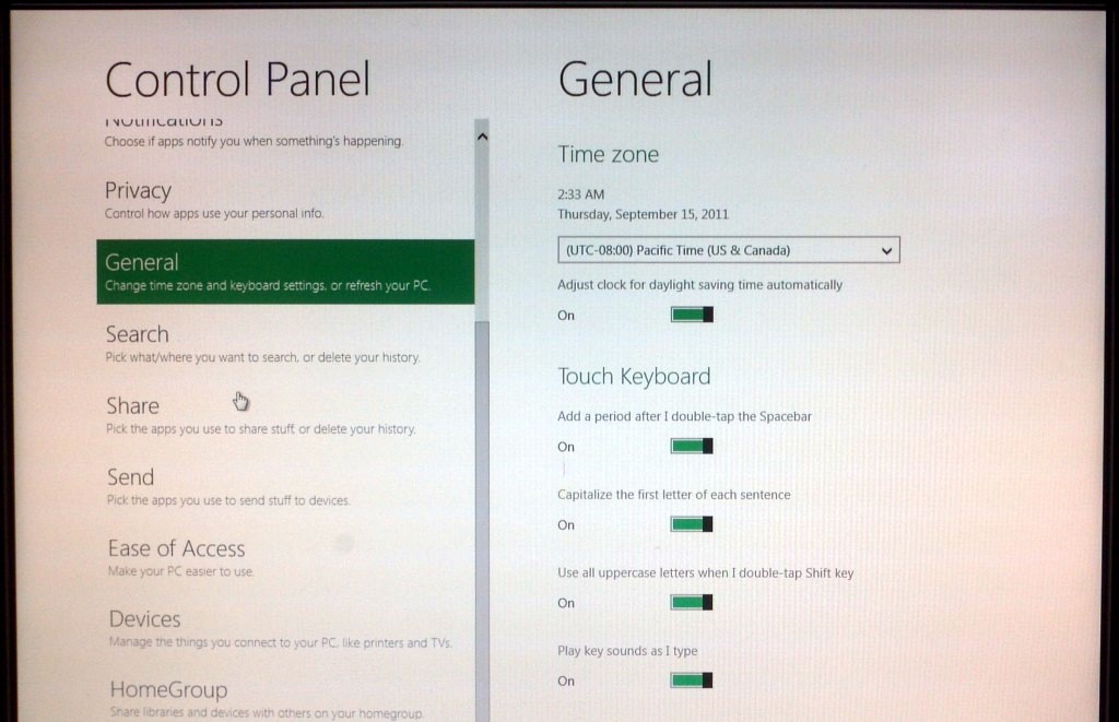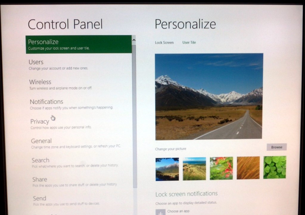 - Personalize, Users, Wireless, Notifications, Privacy, General, Search, Share, Send, Ease of Access, Devices, HomeGroup,,,